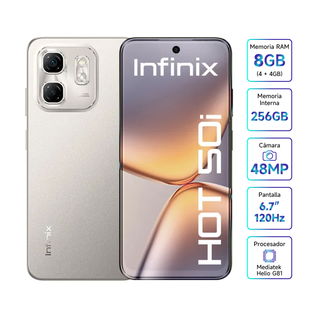 El Infinix Hot 50i combina rendimiento, capacidad y estilo. Su cámara principal de 48MP y batería de 5000mAh aseguran fotos nítidas y uso prolongado. Todo en un diseño elegante y ligero. - Pantalla LCD IPS 6.7” - Resolución HD+ (720x1600) - Capacidad de Ram 4GB más 4GB extendida - Capacidad Memoria Interna 256GB - Procesador Mediatek Helio G81 - Tasa refresco 120Hz - Cámara Principal 48MP - Cámara Frontal 8MP - Lector de huella: Si - Conectividad 4G - Dual SIM: Si - Sistema Operativo Android 14 / XOS 14.5 - Batería de 5000mAh - Carga rápida de 18W - Conector Tipo USB-C - Incluye Cargador, cable de datos y manual - Garantía de la marca 12 Meses - Atención Postventa: Sí