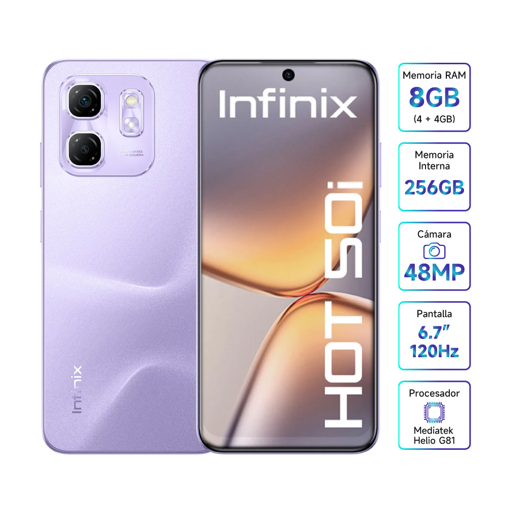 El Infinix Hot 50i combina rendimiento, capacidad y estilo. Su cámara principal de 48MP y batería de 5000mAh aseguran fotos nítidas y uso prolongado. Todo en un diseño elegante y ligero. - Pantalla LCD IPS 6.7” - Resolución HD+ (720x1600) - Capacidad de Ram 4GB más 4GB extendida - Capacidad Memoria Interna 256GB - Procesador Mediatek Helio G81 - Tasa refresco 120Hz - Cámara Principal 48MP - Cámara Frontal 8MP - Lector de huella: Si - Conectividad 4G - Dual SIM: Si - Sistema Operativo Android 14 / XOS 14.5 - Batería de 5000mAh - Carga rápida de 18W - Conector Tipo USB-C - Incluye Cargador, cable de datos y manual - Garantía de la marca 12 Meses - Atención Postventa: Sí