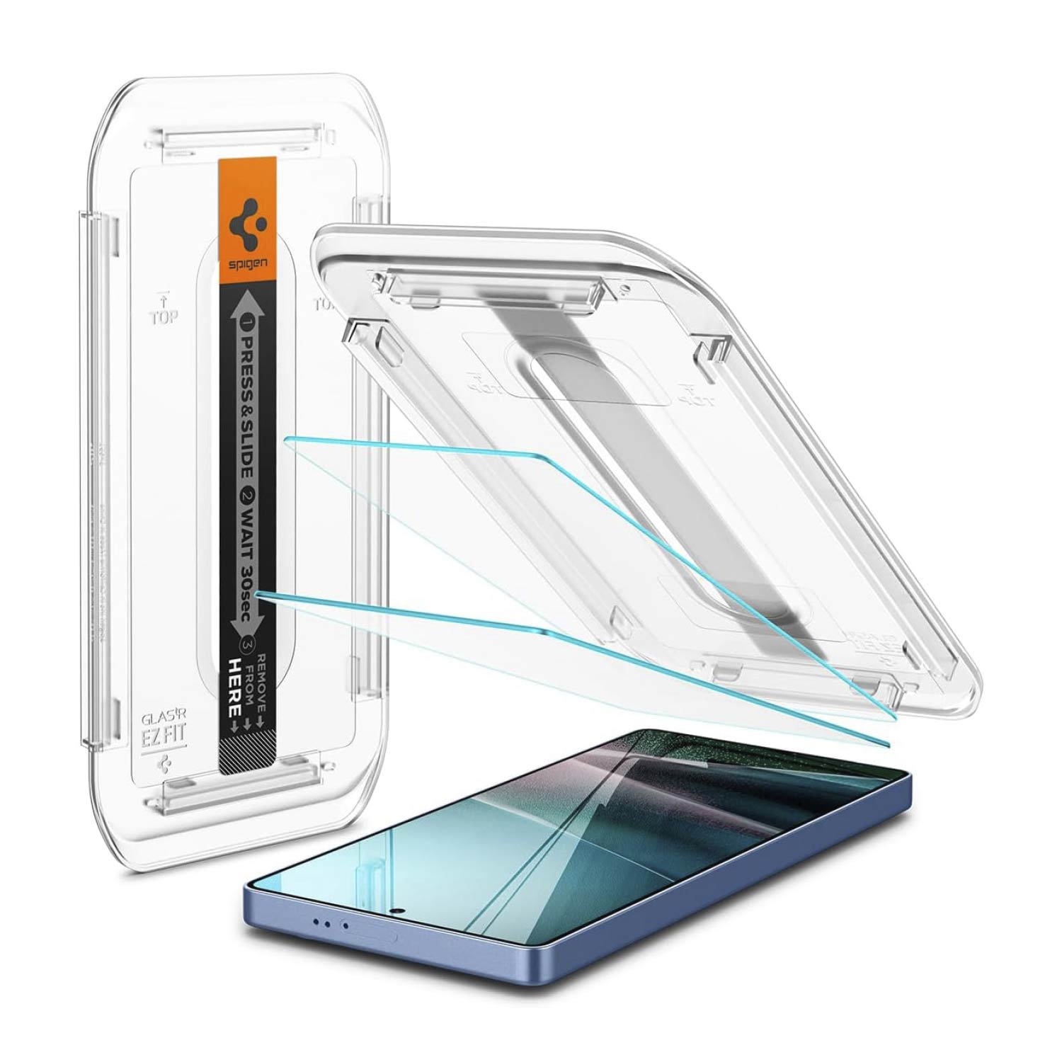 --------------------------------------------------------------------- Somos DASTORE, una tienda especializada en productos Top Premium. Trabajamos con reconocidas marcas importadas de USA / Corea. Al comprar en DASTORE nos comprometemos a entregarte un producto 100% original, nuevo, con la calidad que te mereces y por el precio que estás pagando. ---------------------------------------------------------------------- Calidad superior para una experiencia completa Salva tu pantalla, tu tiempo y tus sensores. EZ Fit SP simplifica la instalación del protector de pantalla. Utiliza la herramienta de alineación para colocar el protector en tu Galaxy, presiona suavemente y ¡listo! Es fácil y sencillo. La superficie se adhiere completamente a la pantalla, resistente a las rayaduras, impactos y huellas. Tipo Protector de pantalla con instalador Marca Spigen País de origen USA Material Vidrio Templado Contenido 2 unidades EZ FIT GLAS.tR Espesor 0.33mm Nivel de resistencia 9H Alto Compatibilidad Galaxy S25 Ultra Tecnología en tus dedos La transmisión de luz es de hasta el 99.9%, por lo cual la claridad de la pantalla se mantiene intacta. Procesado en Alemania por una máquina de control numérico CNC de alta precisión.